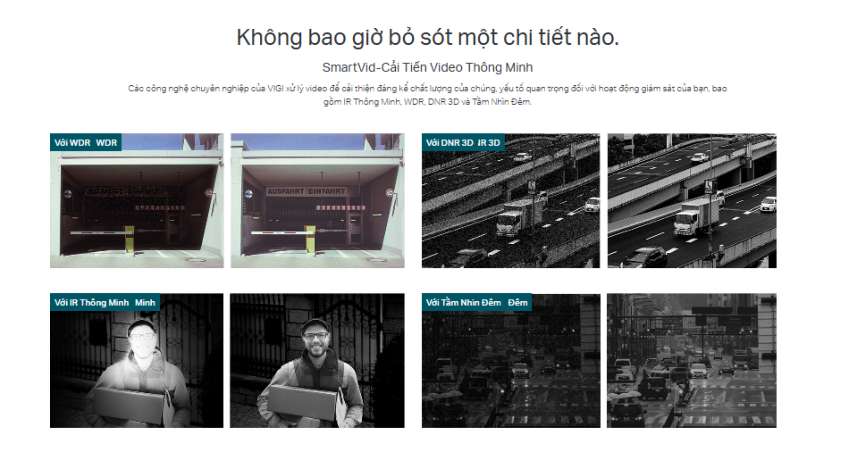 • Cải Tiến Video Thông Minh: Các công nghệ chuyên nghiệp của VIGI xử lý video để cải thiện đáng kể chất lượng của chúng, yếu tố quan trọng đối với hoạt động giám sát của bạn, bao gồm IR Thông Minh, WDR, 3D DNR và Tầm Nhìn Đêm.